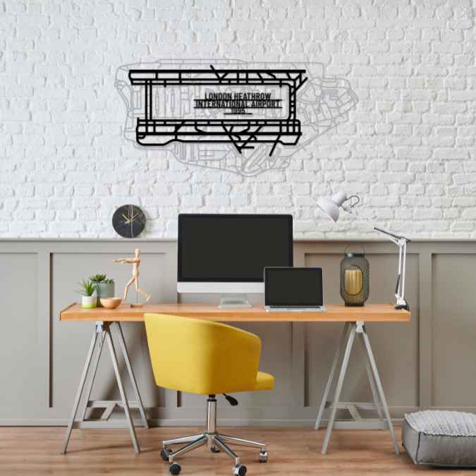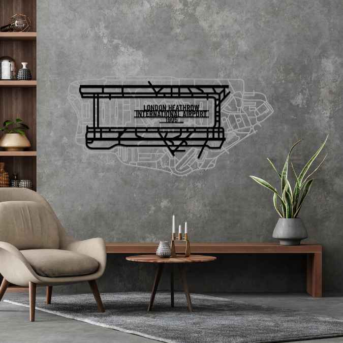 This London Heathrow International Airport metal Silhouette is our multilayer and multicolor 3-piece wall art. It includes the landing strips in our classic black finish and the surrounding area in a shiny and sparkly gray color. To top it off, we attach a metal plate, with the airport's name, and the construction date. This masterpiece alone or in combination with any of our other products will give your office, room, or garage a unique look that will catch the attention of any aviation enthusiast and will add a subtle touch of aviation spirit to your home's interior design.